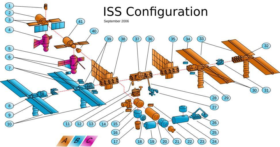 | Keywords: ISS configuration sep-2006 numbers.svg wikitable width 100 4 align center highlight1 English labels - 1 align left highlight2 A 3 align left highlight2 Elements Currently on Orbit - 1 align left highlight2 B 3 align left highlight2 Elements Pending US Shuttle Launch - 1 align left highlight2 C 3 align left highlight2 Elements Pending Russian Launch - 1 align left 1 Docking Compartment DC 1 22 PMA 2 - 2 Zvezda Service Module 23 ESP-1 - 3 SM MMOD Shields 24 JEM PM - 4 Research Module RM 25 JEM RMS Exposed Facility - 5 Multipurpose Laboratory Module MLM and ERA 26 JEM ELM-PS - 6 MLM Outfitting 27 SPDM/ Dextre - 7 ELCs 28 Canadarm2 - 8 S6 Truss Segment 29 ELC - 9 S5 Truss Segment 30 P3/4 Truss Segment - 10 Starboard Photovoltaic Arrays 31 P5 Truss Segment - 11 Mobile Remote Servicer Base System MBS Mobile Transporter MT 32 P6 Truss Segment - 12 Z1 Truss Segment 33 Port Photovoltaic Arrays - 13 Airlock 34 ESP-3 - 14 ESP-2 35 P1 Truss Segment - 15 Node 1 36 SO Truss Segment - 16 Node 3 37 Mobile Servicing System - 17 PMA 3 38 S1 Truss Segment - 18 Cupola 39 S3/4 Truss Segment - 19 Columbus 40 PMA 1 - 20 U S Lab 41 Zarya Control Module - 21 Node 2 wikitable width 100 4 align center highlight1 Polskie podpisy - 1 align left highlight2 A 3 align left highlight2 Elementy już na orbicie - 1 align left highlight2 B 3 align left highlight2 Elementy do wyniesienia przez promy - 1 align left highlight2 C 3 align left highlight2 Elementy do wyniesienia przez pojazdy rosyjskie - 1 align left 1 Śluza powietrzna Pirs DC 1 22 PMA 2 - 2 Moduł serwisowy Zwiezda 23 ESP-1 - 3 Osłona antyuderzeniowa modułu serwisowego 24 Laboratorium japońskie JEM PM - 4 Rosyjski moduł naukowy 25 Laboratorium japońskie JEM RMS i urządzenia odkryte - 5 Wielofunkcyjny moduł laboratoryjny MLM 26 Laboratorium japońskie JEM ELM-PS - 6 Elementy dodatkowe MLM 27 SPDM/ Dextre - 7 ELC 28 Canadarm2 - 8 Kratownica S6 29 ELC - 9 Kratownica S5 30 Kratownice P3/4 - 10 Panele słoneczne sterburty 31 Kratownica P5 - 11 Podstawa urządzeń serwisujących mobilny transporter 32 Kratownica P6 - 12 Kratownica Z1 33 Panele słoneczne bakburty - 13 Śluza 34 ESP-3 - 14 ESP-2 35 P1 Truss Segment - 15 Node 1 36 SO Truss Segment - 16 Node 3 37 Mobile Servicing System - 17 PMA 3 38 S1 Truss Segment - 18 Cupola 39 S3/4 Truss Segment - 19 Columbus 40 PMA 1 - 20 Laboratorium amerykańskie 41 Moduł sterowania Zarja - 21 Node 2 ISS configuration own work based on previous version Translation possible Obsolete diagrams of the International Space Station |
