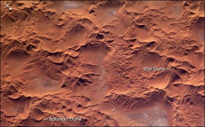 | Keywords: Issaouane Erg, Algeria.jpg en The Issaouane Erg sand sea is located in eastern Algeria between the Tinrhert Plateau to the north and the Fadnoun Plateau to the south Ergs are vast areas of moving sand with little to no vegetation cover Considered to be part of the Sahara Desert the Issaouane Erg covers an area of approximately 38 000 km2 These complex dunes form the active southwestern border of the sand sea The most common landforms in the image are star dunes and barchan or crescent dunes Small linear dunes appear at top left Star dunes are formed when sand is transported from variable wind directions whereas barchan dunes form in a single dominant wind regime The superimposition of two dune types suggests that wind regimes have changed through time The active nature of this portion of the Erg is well illustrated by this image ”smaller dunes form and migrate along the flanks of the larger dunes and sand ridges Occasional precipitation fills basins formed by the dunes; as the water evaporates salt deposits are left behind which appear as bluish-white areas 2012-01-28 http //visibleearth nasa gov/view_rec php id 17085 Astronaut photograph was acquired January 16 2005 with a Kodak 760C digital camera with an 800 mm lens and is provided by the ISS Crew Earth Observations experiment and the Image Science Analysis Group Johnson Space Center The supports the laboratory to help astronauts take pictures of Earth that will be of the greatest value to scientists and the public and to make those images freely available on the Internet Additional images taken by astronauts and cosmonauts can be viewed at the NASA/JSC Custom license marker 2012 01 28 Uploaded with UploadWizard Satellite pictures of Algeria Touat Star dunes Barchan Erg Issaouane Depositional landforms in Algeria |