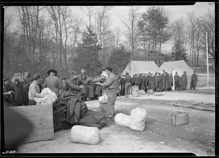 | Keywords: nara:arcid=532782 u.s. national archives usnationalarchives lewis hine lewishine blackandwhite monochrome photo border outdoor black and white Original Caption: Issuing cots and blankets to new replacements just arrived from New York at CCC Camp, TVA #23, located just north of the Clinch River between Walker's Ford and Lone Mountain, Tennessee. These boys will be part of the force working on reforestation and erosion retardation in the Clinch River watershed above Norris Dam, November 1933 U.S. National Archives’ Local Identifier: 142-H-164 Photographer: Hine, Lewis Subjects: New Deal, 1933-1939 Rural areas Tennessee (United States, North and Central America) state Water projects Persistent URL: research.archives.gov/description/532782 Repository: Still Picture Records Section, Special Media Archives Services Division (NWCS-S), National Archives at College Park, 8601 Adelphi Road, College Park, MD, 20740-6001. For information about ordering reproductions of photographs held by the Still Picture Unit, visit: www.archives.gov/research/order/still-pictures.html Reproductions may be ordered via an independent vendor. NARA maintains a list of vendors at www.archives.gov/research/order/vendors-photos-maps-dc.html Access Restrictions: Unrestricted Use Restrictions: Unrestricted Original Caption: Issuing cots and blankets to new replacements just arrived from New York at CCC Camp, TVA #23, located just north of the Clinch River between Walker's Ford and Lone Mountain, Tennessee. These boys will be part of the force working on reforestation and erosion retardation in the Clinch River watershed above Norris Dam, November 1933 U.S. National Archives’ Local Identifier: 142-H-164 Photographer: Hine, Lewis Subjects: New Deal, 1933-1939 Rural areas Tennessee (United States, North and Central America) state Water projects Persistent URL: research.archives.gov/description/532782 Repository: Still Picture Records Section, Special Media Archives Services Division (NWCS-S), National Archives at College Park, 8601 Adelphi Road, College Park, MD, 20740-6001. For information about ordering reproductions of photographs held by the Still Picture Unit, visit: www.archives.gov/research/order/still-pictures.html Reproductions may be ordered via an independent vendor. NARA maintains a list of vendors at www.archives.gov/research/order/vendors-photos-maps-dc.html Access Restrictions: Unrestricted Use Restrictions: Unrestricted |