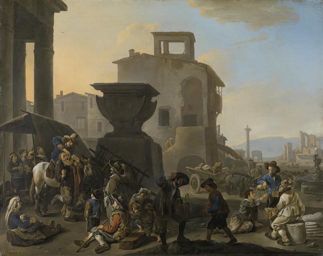 | Keywords: Italiaans marktplein met kiezentrekker Rijksmuseum SK-A-226.jpeg nl Italiaans marktplein met een kiezentrekker te paard In het midden een antiek sarcofaag op een voetstuk links zuilen en rechts in de verte meer ruïnes Op de voorgrond twee Morra-spelers rechts straatverkopers ; Johannes Lingelbach 1622 “1674 olieverf op doek 1651 drager Height cm 68 5 drager Width cm 86 exhibition history Institution Rijksmuseum Technique oil canvas object history Acquisition 1870 object type Potential derivatives exist check http //commons wikimedia org/w/index php search Rijksmuseum+SK-A-226 this search PD-US PD-old-100 Data and photography rights All data and all images made available through the API are either in the public domain or are subject to a CC0 license https //www rijksmuseum nl/en/api/terms-and-conditions-of-use cc-zero place of creation http //www rijksmuseum nl/collectie/SK-A-226 Italiaans marktplein met kiezentrekker Q17319949 Uploaded with GWToolset Italiaans marktplein met kiezentrekker Rijksmuseum SK-A-226 http //www rijksmuseum nl/media/assets/SK-A-226 Images uploaded by Fæ Images from the Rijksmuseum Paintings in the Rijksmuseum Amsterdam |