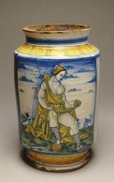 Keywords: Italian - "Albarello" with a Shepherdess Lifting Her Skirt - Walters 482234.jpg An albarello is a cylindrical jar that takes its shape from imported Islamic pottery It belongs to a larger group of wares with predominantly erotic motifs that have initial B or B° on the back The initial most likely refers to the workshop where the jars were made but it could refer a single patron who commissioned the group Sexual imagery is frequently found on Renaissance objects made for private use ca 1500 1520 Renaissance earthenware with tin glaze maiolica cm 20 7 accession number 48 2234 32876 Sir Edgar and Lady Speyer London Walters Art Museum 1961 by purchase Museum purchase 1961 Art and Love in Renaissance Italy Kimbell Art Museum Fort Worth; The Metropolitan Museum of Art New York 2008-2009 place of origin Faenza Italy Walters Art Museum license Italian Renaissance maiolica in the Walters Art Museum Italian art in the Walters Art Museum Upskirt in art Albarello 16th-century ceramics Faenza maiolica |