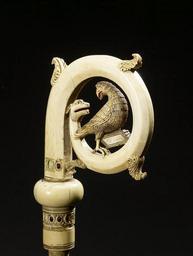 | Keywords: Italian - Crozier Head with the Eagle of Saint John - Walters 71300 - View C.jpg  This crosier possibly made in Sicily in the thirteenth century is made of ivory with a depiction of an eagle set inside the crook The curve of the crook is marked with small leaves or tendrils reminiscent of the swirling vines that form the shapes of illuminated initials in some manuscripts from this period The sprouting curve ends in the head of a dragon with his mouth open and ears flattened against his head and perched within this scroll is an eagle the symbol of John the Evangelist The eagle holds a book inscribed with abbreviated forms of the Latin words for John and Evangelist confirming that this is no ordinary bird but a symbol of the Gospel author The eagle turns his head to confront the dragon eye to eye - a depiction of the power of the Word of God to conquer evil The piece is inset with colored glass and there is evidence that parts of it were once set off with gold and paint century 13 Medieval ivory with polychrome and glass inlay cm 19 6 12 1 4 5 accession number 71 300 24336 Henri Daguerre Paris by purchase Henry Walters Baltimore date and mode of acquisition unknown Walters Art Museum Henry Walters Acquired by Henry Walters An Exhibition of the Treasures of The Walters Art Gallery The Walters Art Museum Baltimore; Pace Wildenstein Gallery New York; Smith College Museum of Art Northampton 1967 Ivory The Sumptuous Art The Walters Art Gallery Baltimore 1983-1984 Illuminated Manuscripts Masterpieces in Miniature The Walters Art Gallery Baltimore 1984-1985 Highlights from the Collection The Walters Art Gallery Baltimore 1998-2001 place of origin Sicily Italy Walters Art Museum license Medieval ivory in the Walters Art Museum Italian art in the Walters Art Museum Ivory croziers Media contributed by the Walters Art Museum needs category review |