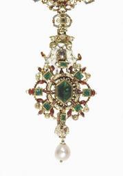 | Keywords: Italian - Jeweled Collar - Walters 44508 - Detail.jpg This splendid piece of jewelry which we would call a necklace could have been worn without or with a pendant around the neck or in the case of a woman the waist The pendant might be a large mounted jewel or an insignia of office or an order In the 19th or early 20th century the collar was repaired Apparently at that time someone added to the bottom of the pendant a tiny enameled figure of a white sheep-symbol of the great Habsburg military Order of the Golden Fleece This presumably added to the collar's value by introducing an exclusive historical association An American buyer would not have known that the presentation of the historical elements is incorrect ca 1550 1600 Renaissance gold enamel emeralds diamonds cm 73 3 accession number 44 508 9606 Henry Walters Baltimore date and mode of acquisition unknown Walters Art Museum Henry Walters Acquired by Henry Walters World of Wonder The Walters Art Gallery Baltimore 1971-1972 Jewelry - Ancient to Modern The Walters Art Gallery Baltimore 1979-1980 Objects of Adornment Five Thousand Years of Jewelry from the Walters Art Gallery Baltimore Cooper-Hewitt National Design Museum New York; Chrysler Museum of Art Norfolk; Carnegie Museum of Art Pittsburgh; San Antonio Museum of Art San Antonio; Philbrook Museum of Art Tulsa; Honolulu Academy of Arts Honolulu; New Orleans Museum of Art New Orleans; Milwaukee Art Museum Milwaukee; Minneapolis Institute of Arts Minneapolis; Toledo Museum of Art Toledo; The John and Mable Ringling Museum of Art Sarasota 1984-1987 Jewelry from the Walters Art Museum and the Zucker Family Collection The Walters Art Gallery Baltimore 1987 place of origin Italy Walters Art Museum license Renaissance applied arts in the Walters Art Museum Jewellery in the Walters Art Museum Italian art in the Walters Art Museum Media contributed by the Walters Art Museum needs category review Media contributed by the Walters Art Museum needs artist review Badges of the Order of the Golden Fleece |