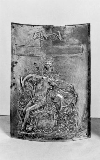 | Keywords: Italian - Tabernacle Door with Pietà - Walters 54346.jpg  The Host Communion wafer consecrated by the priest was preserved inside the tabernacle During the Mass Christ's body is believed to become miraculously present in the Host transubstantiation The Mass is a symbolic reenactment of his sacrifice which explains the image of the Pietà the Virgin Mary holding the dead Christ-an image combining the ultimate in pity and piety on the tabernacle This relief is one of many copies of an image that was believed to be miraculous preserved in a church in the city of Chioggia south of Venice ca 1580 1600 gilded bronze cm 23 3 16 7 accession number 54 346 32209 Henry Walters Baltimore date and mode of acquisition unknown Walters Art Museum Henry Walters Acquired by Henry Walters place of origin Germany Walters Art Museum license Baroque art in the Walters Art Museum Italian art in the Walters Art Museum Media contributed by the Walters Art Museum needs category review |