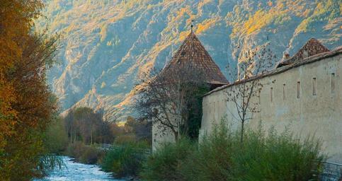 Keywords: italy landscape nature outside fall autumn mountains forest trees woods wall building stream water grass plants country countryside road
