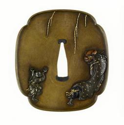 Keywords: Iwamoto Konju - Tsuba with Lion Dancers - Walters 51105.jpg The lion dance is usually performed as part of the New Year's celebrations On this tsuba two performers dance in the lion costume along with a third masked figure who is also part of the dance The lion dance tradition developed in China from a belief that the dance would protect villages from evil spirits Stylized lions such as this are known as Chinese lions shishi in Japan A willow tree decorates the back and its boughs also appear in the upper portion of the front side The tsuba is signed with a seal on the reverse 1815 late Edo sentoku shibuichi with gold silver and copper detail cm 7 7 7 03 0 42 accession number 51 105 35471 Henry Walters Baltimore date and mode of acquisition unknown Walters Art Museum 1931 by beqeust Acquired by Henry Walters Seal Konju place of origin Edo present-day Tokyo Japan Walters Art Museum license Tsuba in the Walters Art Museum Iwamoto Konju Media contributed by the Walters Art Museum needs category review Reliefs of dancers on Japanese sword fittings |