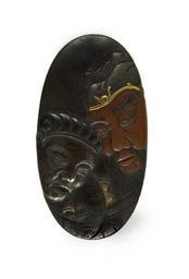 | Keywords: Iwamoto Konkan - Kashira with the Chinese General Kanyu (Ch Guan Yu -Kuan Yu-) - Walters 51945.jpg The figure on the right is the 2nd-century Chinese general Kanyu Ch Guan Yu Kuan Yu He is accompanied by either his chief retainer Zhou Cang Chow Ts'ang or his son Kwan Bin Kwan Pin This is a part of a set with Walters 51 944 between 1744 1801 Edo shibuichi gold copper cm 3 3 l accession number 51 945 22412 William T / Henry Walters Collection Baltimore date and mode of acquisition unknown Walters Art Museum Henry Walters Acquired by William T or Henry Walters place of origin Edo present-day Tokyo Japan Walters Art Museum license Kashira in the Walters Art Museum Iwamoto Konkan Media contributed by the Walters Art Museum needs category review |