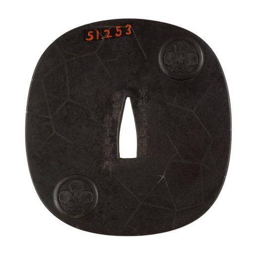 | Keywords: Iwamoto Konkan - Tsuba with Marishiten - Walters 51253 - Back.jpg Standing on a charging bull at the right side of this tsuba is the Buddhist deity Marishiten She is known as the Queen of Heaven despite her masculine appearance She has three faces Her six arms normally eight carry a sword a bow and arrow and a spear She is believed to reside in the stars of Ursa Major The inscription on the front says that it was presented by the Suwa clan by orders of the ruler The Suwa clan controlled the area that is now Nagano prefecture The reverse has two Suwa oak leaf crests 1793 Edo iron silver gold copper shakudo cm 8 9 8 5 0 59 accession number 51 253 25631 Henry Walters Baltimore date and mode of acquisition unknown Walters Art Museum Henry Walters Acquired by Henry Walters Dedication Suwa uji tatematsuru kunmei; Date Kansei go mizu-no-to ushi toshi yƓfuku ; Signature kin ji sen Iwamoto Konkan; Translation Presented to the Suwa clan by orders of the ruler / Fifth year of Kansei 1793 the year of the ox November / Respectfully engraved by Iwamoto Konkan kao place of origin Edo present-day Tokyo Japan Walters Art Museum license Tsuba in the Walters Art Museum Iwamoto Konkan Media contributed by the Walters Art Museum needs category review |