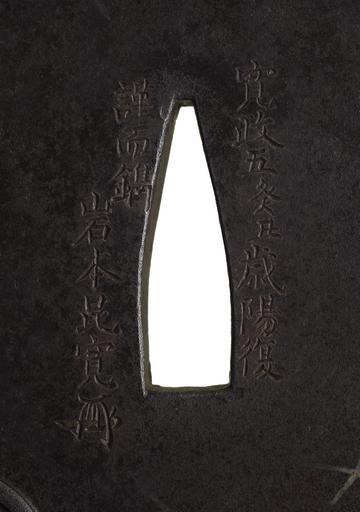 | Keywords: Iwamoto Konkan - Tsuba with Marishiten - Walters 51253 - Mark A.jpg Standing on a charging bull at the right side of this tsuba is the Buddhist deity Marishiten She is known as the Queen of Heaven despite her masculine appearance She has three faces Her six arms normally eight carry a sword a bow and arrow and a spear She is believed to reside in the stars of Ursa Major The inscription on the front says that it was presented by the Suwa clan by orders of the ruler The Suwa clan controlled the area that is now Nagano prefecture The reverse has two Suwa oak leaf crests 1793 Edo iron silver gold copper shakudo cm 8 9 8 5 0 59 accession number 51 253 25631 Henry Walters Baltimore date and mode of acquisition unknown Walters Art Museum Henry Walters Acquired by Henry Walters Dedication Suwa uji tatematsuru kunmei; Date Kansei go mizu-no-to ushi toshi yƓfuku ; Signature kin ji sen Iwamoto Konkan; Translation Presented to the Suwa clan by orders of the ruler / Fifth year of Kansei 1793 the year of the ox November / Respectfully engraved by Iwamoto Konkan kao place of origin Edo present-day Tokyo Japan Walters Art Museum license Tsuba in the Walters Art Museum Iwamoto Konkan Media contributed by the Walters Art Museum needs category review |
