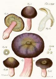 | Keywords: J.C.Schaeffer- Fung. bavar. palat. nasc. Plate 214.png in Latin / German Translation ;Explanation of 214th copperplate engraving The 102nd agaric<br/> Fig I A still undeveloped fruiting body; with almost spherical cap <br/> Fig II A developed fruiting body; flat cap <br/> Figure III IV fruiting bodies of various developments and shapes <br/> Figure V Underside of a developed fruiting body <br/> Figure VII VIII The natural spore deposit and enlarged spores<br/> Image processed original copy at http //bibdigital rjb csic es/ing/Libro php Libro 1735 Pagina 34 LIBRARY Real Jardin Botánico CSIC 1770 Jacob Christian Schäffer 30 May 1718 - 5 January 1790 PD-old-100 Fungorum qui in Bavaria et Palatinatu circa Ratisbonam nascuntur Russula xerampelina |