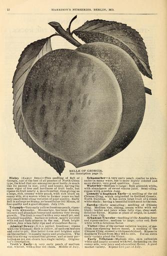 Keywords: J.G. Harrison and Sons nurseries (16776262642).jpg <br> Troth's Early A very early peach of medium <br> size whitish with a fine red cheek Middle of July <br> Schumacher A very early peach similar to Alex- <br> ander in many ways but is more highly colored and <br> more showy very good qualities June <br> Waterloo Medium to large; flesh greenish white <br> with abundance of sweet vinous juice Semi-cling <br> ripens with Amsden June <br> Connett's Southern Early A seedling of the old <br> Chinese Cling which originated in Guilford County <br> North Carolina It has extra large fruit of a cream <br> white shade ; having a beautiful blush next to t he sun <br> Eureka Early semi-cling; seedling of Chinese <br> cling Medium size oblong cream white with red <br> blush; tender and juicy when fully ripe clear seed <br> delicious flavor Ripens at place of origin in I ouisi- <br> ana June 15th <br> Arkansas Traveler Seedling of the Amsden June <br> and ripens earlier ; medium to large ; color red flesh <br> white with a delicious flavor <br> Victor One of the earliest varieties known of me- <br> dium size ripening before Sneed A seedling of the <br> Chinese Cling crossed with Spanish blood Ripens in <br> Southern Texas from May 8th to 16th For an extra <br> early variety plant the Victor <br> Early Tillotson Medium size skin yellowish <br> white and nearly covered with red darkening on the <br> sunny side very juicy and of excellent flavor A good <br> market variety Ripens first part of July 43766119 148656 77544 Page 12 Text http //www biodiversitylibrary org/page/43766119 1904 10 5962/bhl title 77544 Harrison's Nurseries Berlin Md ; Henry G Gilbert Nursery and Seed Trade Catalog Collection NameFound Medium NameConfirmed Medium NameBankID 4904049 NameFound Origina Biodiversity Heritage Library J G Harrison Sons nurseries Garden Stories Catalogs Harrison's Nurseries Berlin Md Nurseries Horticulture Seeds U S Department of Agriculture National Agricultural Library bhl page 43766119 dc identifier http //biodiversitylibrary org/page/43766119 bhlGardenStories Belle of Georgia apple BHLinbloom harrison's nurseries berlin md nurseries horticulture u s department of agriculture national agricultural library bhlgardenstories belle of georgia apple bhlinbloom Information field Flickr posted date ISOdate 2015-03-10 CC-BY-2 0 BioDivLibrary https //flickr com/photos/61021753 N02/16776262642 2015-08-24 01 54 34 cc-by-2 0 PD-old-70-1923 J G Harrison Sons nurseries Photos uploaded from Flickr by FĂŚ using a script |