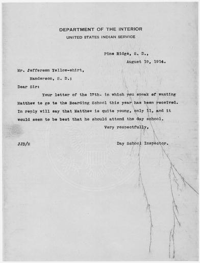 Keywords: J.J. Duncan to Jefferson Yellow-shirt, Manderson, South Dakota. - NARA - 284513.tif Scope and content General notes 284513 Local identifier Department of the Interior Office of Indian Affairs Pine Ridge Agency 1878 - 09/17/1947 NARA's Central Plains Region Kansas City NREA 400 West Pershing Road Kansas City MO 64108 1914-08-19 Record group Record Group 75 Records of the Bureau of Indian Affairs 1793 - 1999 Record group ARC 404 Correspondence of the Day School Inspector J J Duncan compiled 02/09/1910 - 09/06/1916 Series ARC 283922 File unit Correspondence of Day School Inspector J J Duncan January 4 1914 to September 30 1914 01/04/1914 - 09/30/1914 File unit ARC 284437 Variant control numbers NAIL Control Number NRE-75-169-G-76 yes Other versions NARA-cooperation PD-USGov Documents related to Pine Ridge Indian Reservation