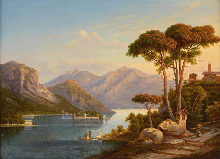 | Keywords: J M Leitzmann Isola Bella 1851.jpg Isola Bella Lago Maggiore Signiert Öl auf Leinwand 44 x 60 cm Datiert 1851 http //www duesseldorfer-auktionshaus de/ 1851 J M Leitzmann PD-Art Images from Düsseldorfer Auktionshaus 1851 paintings Historical images of Isola Bella Stresa Landscape paintings of Italy Lake Maggiore in art 1850s landscape paintings |