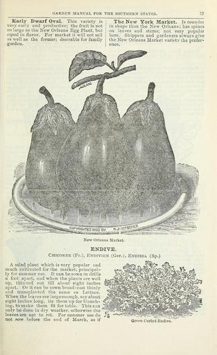 | Keywords: J. Steckler Seed Co., Ltd. garden manual 1900 (16547011796).jpg GARDEN MANUAL FOR THE SOUTHERN STATES <br> <br> Early Dwarf Oval This variety is <br> very early and productive; the fruit is not <br> so large as the New Orleans Egg Plant but <br> equal in flavor For market it will not sell <br> as well as the former; desirable for family <br> garden <br> The New York Market Is rounder <br> in shape than the New Orleans; has spines <br> on leaves and stems; not very popular <br> here Shippers and gardeners always give <br> the New Orleans Market variety the prefer- <br> ence <br> -rr- l ; -; 'i'; <br> New Orleans Market <br> ENDIVE <br> Chicoree Fr Endivien Gen Endibia Sp <br> A salad plant which is very popular and <br> much cultivated for the market principal- <br> ly for summer use It can be sown in drills <br> a foot apart aud when the plants are well <br> up thinned out till about eight inches <br> apart Or it can be sown broad-cast thinly <br> and transplanted the same as Lettuce <br> When the leaves are largeenough say about <br> eight inches long tie them up for blanch- <br> ing to make them fit for table This can <br> only be done in dry weather otherwise the <br> leaves are apt to rot For summer use do <br> not sow before the end of March as if <br> <br> Green Curled Endive 43933558 150250 78709 Page 57 Text http //www biodiversitylibrary org/page/43933558 1900 10 5962/bhl title 78709 Henry G Gilbert Nursery and Seed Trade Catalog Collection ; J Steckler Seed Co Biodiversity Heritage Library J Steckler Seed Co Ltd garden manual 1900 dealers in vegetable flower field and grass seeds Garden Stories Catalogs J Steckler Seed Co Seed industry and trade Seeds Trade catalogs Vegetables U S Department of Agriculture National Agricultural Library bhl page 43933558 dc identifier http //biodiversitylibrary org/page/43933558 bhlGardenStories Eggplant BHLinbloom j steckler seed co u s department of agriculture national agricultural library bhlgardenstories bhlinbloom Information field Flickr posted date ISOdate 2015-02-18 CC-BY-2 0 BioDivLibrary https //flickr com/photos/61021753 N02/16547011796 2015-08-24 02 50 18 cc-by-2 0 PD-old-70-1923 Eggplant J Steckler Seed Co Ltd garden manual 1900 Photos uploaded from Flickr by Fæ using a script |