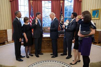 | Keywords: Jack Lew sworn in as Treasury Secretary.jpg en United States President Barack Obama watches as Vice President Joe Biden swears in Treasury Secretary Jack Lew during a ceremony in the Oval Office on 28 February 2013 Lew's family pictured from left are wife Ruth Schwartz; granddaughter Eliora Lew; son Danny Lew; daughter Shoshana Lew; daughter-in-law Zahava Lew; and grandson Moshe Lew 2013-02-28 12 42 03 http //www flickr com/photos/whitehouse/8515754871 White House P022813PS-0189 Pete Souza DEFAULTSORT 20130228124203 PD-USGov Uploaded with UploadWizard Barack Obama in 2013 Joe Biden in 2013 Jacob Lew Barack Obama in the Oval Office Children in the Oval Office Photographs by Pete Souza Taken with Canon EOS 5D Mark III Uploaded by O'Dea |