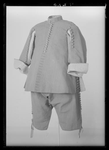 | Keywords: Jacka av grå kamlott. Tillhört Karl X Gustav (1622-1660) - Livrustkammaren - 9920.tif Denna dräkt består av jacka byxor och kanoner av grå kamlott d'Hollande Materialet är gråbrun yllekamlott med en vådbredd av 77 cm utan stad 20x8 5 tr/cm2 Varpen består av 1ljus och 1 mörk tråd som tvinnats åt höger tillsammans och inslaget består av 3 ljusa otvinnade trådar Staden utgörs av enbart 2 vita trådar <br/><br/>Jackan som till sin form mycket påminner om jackan till dräkt nr 3419 är sydd av 4 storastycken som vidgats i sidorna och rundats i kanten Den har ca 37 cm öppna skört i sidornaoch bak Jackan har sytts ihop med korta sidosömmar och mitt bak endast till midjan Ärmarna består av 2 stycken och har öppna framsömmar Jackan är mitt fram 69 cm lång ståndkragen oräknad denna är 5 cm hög mitt fram och mitt bak 3 5 cm Mitt bak är jackan 73cm lång utan krage Den har sytts så att dess korta sidosömmar sömmen mitt bak ochaxelsömmarna sytts samman från baksidan <br/><br/>Ärmarna har sytts ihop så att överstyckena ligger ovanpå de undre i den utsvängda baksömmenoch ärmarna har sedan trätts genom ärmhålet Endast den lilla korta framsömmen 15 cmlång nedanför det ca 35 cm långa sprundet har sytts ihop från baksidan I baksömmen påärmen är den nedre - raka - delen ca 15 cm lång öppen för att kunna bilda uppslag och harhär försetts med en skoning av brun rips Jackan verkar ej ha haft något mellanfoder men iärmuppslagen sitter papper mellan fodret och tyget Detta utgör styvnad för denursprungliga fastsydda garneringen av silverspets ty täta hål efter stygn visar att mansytt genom pappret det har varit en ca 9 cm bred spetsbesättning Jackan är fodrad medsilvermoiré med en vådbredd av 49 cm utan stad 64x14 tr/cm2 Varp och inslag är av vittotvinnat silke I varje inslag ligger på rätan en silverlan Stad 0 7 cm 6 gröna 6 gula 6 gröna 6 gula 6 gröna trådar samt 1 tjock vit - ripsbindning Mitt i tyget syns en randefter vattringen <br/><br/>Jackans foder är skuret på samma sätt som tyget i övrigt dock har man omedelbart ovanförsidoskörtets öppning satt in 2 horisontella kilar för att göra plagget mindre åtstramande De är något varierande i storlek och placering men ca 1 cm långa Fram har jackan en helobruten rad av knapphål på vänster sida vilket ju icke är fallet med jackan nr 23 Det ärinalles 29 knapphål 3 5 cm långa och sydda med brunt högertvinnat silke över silkestråd 8stygn/cm På höger sida sitter utefter hela kanten 28 st d 2 cm knappar av vilka dockendast de 17 översta kunnat begagnas eftersom fodret täcker de följande På vänsterframstycke finns i sidokanten 15 knappar och på höger framstyckes sidokant 16 st svarandemot de 16 knapphål som sitter i sidostyckena och baksprundet Inte någon knapp i sprundenmitt bak eller i sidorna har kunnat knäppas ty fodret har hela vägen sytts över hålen Baktill finns på vänster stycke endast 13 knappar kvar På vänster ärms överstycke sitterav knappgarneringen endast 8 knappar kvar på höger ärm finns 14 knappar kvar Ärmarnasbakstycken har vardera 16 knapphål Ärmuppslagen har skoning av brun rips på kamlotten <br/><br/>Kragen som är försedd med styvnad av fiskben instoppade i oblekt linnelärft 19x18tr/cm2 i vertikala avsyningar på drygt ½ cm s avstånd har ursprungligen varit fodrad medljus taft på insidan Detta tyg saknas nu nästan helt I jackan sitter axelsömmarna 2 sthängslen av linnelärft 20x17 tr/cm2 klädda med gulvitt siden De är något kortare framåtän bakåt och har 3 tränsade hål i varje ända så att möjlighet att reglera byxorna längdföreligger Jackan är på ärmarna och längs sprunden översållad av trådrester av grått silke även något enstaka prov på blått silke som tyder på en ursprungligen fastsydd garneringrunt kanterna I 1675 och 1691 års inventarier anmärks också att spetsarna sprättats bort isamband med 1675 års kröning original caption decade 1650 woollen Färg grå d1 - dräkt - yttermaterial material ylle - silver d2 - dräkt - foder material silver LRK Karl X Gustav av Sverige Museum Tre Kronor / Ståthållarämbetet - STÄ tidigare Kungl Husgerådskammaren 1999-2013 Modelejon 2002 place of origin original filename LN_B10731_013611 58011 inventory number LRK 21476 9920 CC0 Jacka av grå kamlott Tillhört Karl X Gustav 1622-1660 - Livrustkammaren - 9920-negative tif <gallery caption Different images of same object > File Jacka av grå kamlott Tillhört Karl X Gustav 1622-1660 - Livrustkammaren - 1360 tif File Jacka av grå kamlott Tillhört Karl X Gustav 1622-1660 - Livrustkammaren - 18482 tif File Jacka av grå kamlott Tillhört Karl X Gustav 1622-1660 - Livrustkammaren - 27044 tif </gallery> Clothing Media contributed by LSH unmatched objKeyword Clothing in Livrustkammaren 1650s fashion Media contributed by LSH 2013-10 |