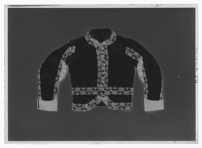 | Keywords: Jacka till Serafimerordensdräkt - Livrustkammaren - 35668-negative.tif Midjekort jacka av vitt siden med isydd lång ärm och knäppning mitt fram i form av 13 svarta välvda räfflade knappar överspunna med svart silke Jackan kantad med 60 mm bred genombruten svart spets Ryggstycket skuret med figursömmar samt ryggsöm Denna och de övriga sömmarna belagda med svart spets Mittbak 70 mm långt sprund två likadana i de övriga sömmarna bak <br/><br/>Ärmsömmarna belagda med svart spets Nedtill slag av svart siden b 70 mm uppdraget i en spets mittfram Samt med sprund l 80 mm med ett knapphål I främre ärmsömmen mitt för armvecket ett halsfäriskt rynkat sidenstycke l 160 mm <br/><br/>Foder av gulvit bomull På vänster sida innerficka Utmed framkanterna mörkblått siden Hela jacka vadderad original caption decade 1840 silk Färg vit d1 - dräkt - yttermaterial material siden - silk Färg svart d5 - dräkt - knappar och spännen material silke - lace Färg svart d4 - Dräkt - passpoaler band kantning uppslag material spets - cotton Färg gulvit d2 - dräkt - foder material bomull size mm 555 fram size mm 550 bak size mm 610 ärm LRK Magnus F F Björnstjerna greve general place of origin original filename LN_B11364_014244 51775 inventory number LRK 15224 35668 CC0 Jacka till Serafimerordensdräkt - Livrustkammaren - 35668 tif <gallery caption Different images of same object > File Jacka till Serafimerordensdräkt - Livrustkammaren - 44227 tif </gallery> |