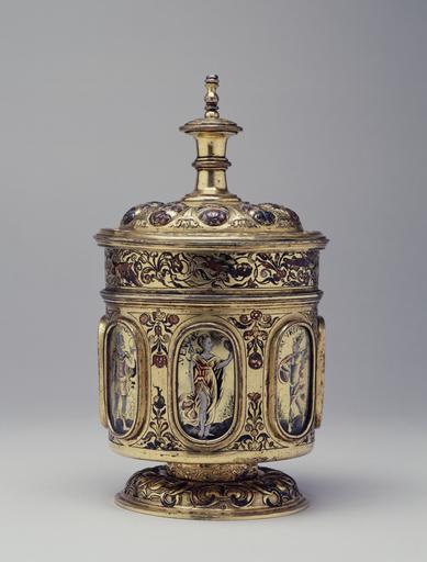 | Keywords: Jacob Fröhlich - Beaker with a Sundial - Walters 58220.jpg This lidded beaker or cup is actually a timepiece More precisely it is an elaborate and rare type of sundial that is quite accurate Time is measured by the shadow of the tip of the gnomon the vertical rod inside the cup indicating the hours along the spiraling lines engraved around the side wall This tells two versions of the time according to different systems Arabic numbers mark lines indicating German hours which are like ours 24 of the same length making up one day Roman numerals mark the planet hours within one day the period of daylight is divided into 12 hours which change in length with the seasons At the time this timepiece was made the older planet-hour system was rapidly being replaced given a new emphasis on the mechanization of the clock with its hours of equal length The system of vertical lines and points marked by the signs of the zodicac- such as the crab for Cancer- indicates the date As well as telling the time there is a scale between the two types of numbers that established the height of the sun Finally a chamber under the base once housed a compass making this a multipurpose scientific instrument With its engraved decoration and reverse painted glass insets- with the days of the week represented by the seven planetary gods based on woodcuts by the German master Virgil Solis- this is a splendid example of Nuremberg goldsmith work Indeed the city's coat of arms featuring the Habsburg double-headed eagle is on the cap to the chamber under the base at left The beaker was probably made as an official present from the city The initial recipient may have been Francis of Padua identified in the inscription on the underside of the cover as a physician working in the Italian city of Forli but who is otherwise unknown ca 1560 Renaissance amelierung gilt on brass reverse-painted glass and colored resins cm 16 3 accession number 58 220 774 Raoul Heilbronner Paris by purchase Henry Walters Baltimore 1908 by purchase Walters Art Museum Henry Walters Acquired by Henry Walters 1908 World of Wonder The Walters Art Gallery Baltimore 1971-1972 place of origin south Nuremberg Germany Walters Art Museum license Renaissance clocks Portable sundials Renaissance applied arts in the Walters Art Museum Media contributed by the Walters Art Museum needs category review Media contributed by the Walters Art Museum needs artist review |