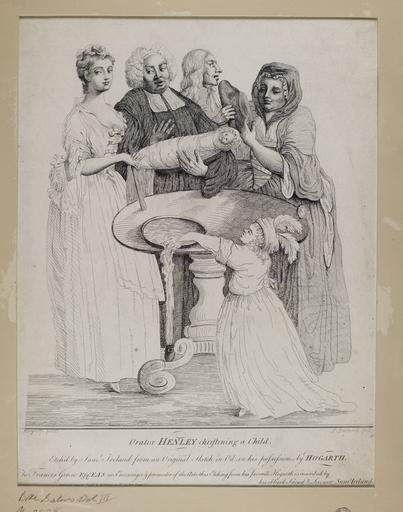 | Keywords: Jacobite broadside - Orator Henley christening a Child.jpg Picture of Henley holding a baby surrounded by two women and one man along with a very small woman who is tipping out the water from the baptismal pedestal The man in the background looks very uninterested Etch'd by Sam l Ireland from an Original Sketch in Oril in his possession by Hogarth To Francis Grose Esq r F A S an Encourager and promoter of the Arts this Etching from his favorite Hogarth is inscribed by his obliged friends and Servant Sam l Ireland Size cm 0 0 exhibition history Institution National Library of Scotland Prints and broadsides object history object type PD-old-70-1923 place of creation Blaikie SNPG 75241607 Jacobite broadside - Orator Henley christening a Child Uploaded with GWToolset Jacobite broadside - Orator Henley christening a Child http //deriv nls uk/56YK98Q/7524/75241609 2 jpg Images uploaded as part of NLS-WMUK collaboration Jacobite broadsides |
