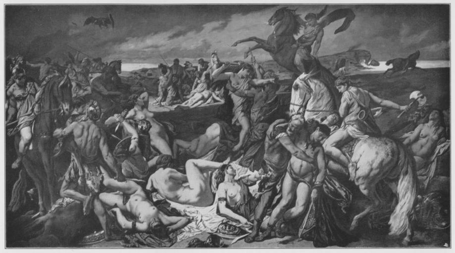 | Keywords: Jahrhundertausstellung 1906 KatNr. 0483.jpg Artwork Creator Anselm Feuerbach Amazonenschlacht Oil Canvas cm 500 800 Stadt Nürnberg lt Quelle self scanned from own book Vorstand der Deutschen Jahrhundertausstellung Herausgeber žKatalog zur Ausstellung deutscher Kunst aus der Zeit von 1775 “1875 in der Königlichen Nationalgalerie Berlin Verlag F Bruckmann AG München 1906 2 Bände 1873 PD-old-70-1923 Other versions Paintings by Anselm Feuerbach in the Alte Nationalgalerie Jahrhundertausstellung deutscher Kunst 1906 Anselm Feuerbach in Jahrhundertausstellung deutscher Kunst 1906 ImageNote 1 28 24 2702 1473 2761 1539 2 Das Fleisch in einem gelblichbräunlichen Ton der in den in der Mitte liegenden Weibern am hellsten ist und nach allen Seiten namentlich nach links an Tiefe zunimmt Hier erreicht er in dem Pferd zur äußersten Linken ein tiefes Havanabraun Das korrespondierende Pferd rechts weißgrau mit Spuren von Gelb Das Grau wird am tiefsten in dem sich aufbäumenden Pferd des Hintergrundes und im Himmel zumal in der linken Hälfte und mischt sich mit dem Braun In den Stoffen herrschen weinrote Töne vor “ Bez rechts unten AFeuerbach 73 Das A und F monogrammiert “ Allgeyer-Neumann Nr 558 ImageNoteEnd 1 |