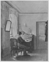 | Keywords: Jahrhundertausstellung 1906 KatNr. 0824.jpg Artwork Creator Georg Friedrich Kersting Stube mit sitzendem Mann Nach A Aubert ist der Dargestellte Gerhard von Kügelgen Oil Canvas cm 46 5 36 5 Großherzogl Schloß Weimar lt Quelle self scanned from own book Vorstand der Deutschen Jahrhundertausstellung Herausgeber žKatalog zur Ausstellung deutscher Kunst aus der Zeit von 1775 “1875 in der Königlichen Nationalgalerie Berlin Verlag F Bruckmann AG München 1906 2 Bände 1811 PD-old-100-1923 Other versions Paintings by Georg Friedrich Kersting Jahrhundertausstellung deutscher Kunst 1906 ImageNote 1 15 18 1182 1503 1226 1544 2 Kombination von Weiß Grau und Hellbraun Die Decke und Türe in einem Grau das auch im Weiß der Gardinen und Gipse mitwirkt Der graue weißbelichtete Stuhl ist mattgrün bezogen In den Wänden nimmt das Grau einen kaum wahrnehmbaren gelben und violetten Schimmer an Diese Farbe scheint nach einem violetten Grau verdichtet in dem Rock des Mannes während das Beinkleid in dem hellen Braun des Schreibtisches und noch mehr in dem Braungrau des Fußbodens gehalten ist “ Nach A Aubert ist der Dargestellte Gerhard von Kügelgen “ Bez unten links braun G Kersting 1811 ImageNoteEnd 1 |