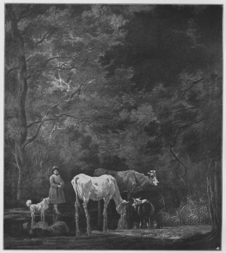 | Keywords: Jahrhundertausstellung 1906 KatNr. 0852.jpg Artwork Creator Wilhelm von Kobell Die Furt Oil Canvas cm 141 124 Kgl Gemäldegalerie Kassel lt Quelle self scanned from own book Vorstand der Deutschen Jahrhundertausstellung Herausgeber žKatalog zur Ausstellung deutscher Kunst aus der Zeit von 1775 “1875 in der Königlichen Nationalgalerie Berlin Verlag F Bruckmann AG München 1906 2 Bände 1798 PD-old-100-1923 Other versions Wilhelm von Kobell Jahrhundertausstellung deutscher Kunst 1906 ImageNote 1 34 17 1755 2008 1827 2046 2 Vor dem grünbraunen Dunkel der Bäume und dem dunkelblauen Grund leuchtet das weiße Fell der saufenden Kuh die in den beschatteten Teilen ein helles Ockergelb zeigt In dem beleuchteten Rücken der Ziege ist das Weiß bläulich gestimmt Die hintere Kuh lehmbraun mit gelblichem Weiß in dem beleuchteten Teil des Kopfes Das Mädchen in brauner Fleischfarbe braunem Rock mit dunklen Falten und graublauer Jacke In dem Hut Blau und Schwarz Der Hund weißbelichtetes Gelbbraun “ Bez unten links eingekratzt Wilhelm Kobell 1798 ImageNoteEnd 1 |