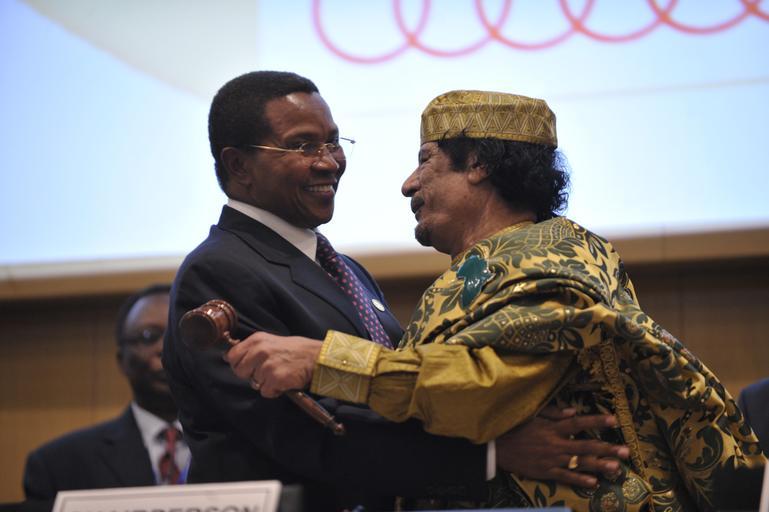 | Keywords: Jakaya Kikwete and Muammar al-Gaddafi, 12th AU Summit, 090202-N-0506A-678.jpg Jakaya Kikwete left the president of Tanzania embraces Muammar Qaddafi the Libyan chief of state in the Plenary Hall of the United Nations building in Addis Ababa Ethiopia during the 12th African Union Summit Feb 2 2009 The assembly elected Qaddafi to relieve Kikwete as chairperson of the African Union DefenseImagery mil http //defenseimagery mil/imagery html guid 5d8e13af5f43719e7835e4ec375c827782eaafdc VIRIN 090202-N-0506A-678 2009-02-02 U S Navy photo by Mass Communication Specialist 2nd Class Jesse B Awalt/Released PD-USGov-Military-Navy Jakaya Kikwete Muammar Gaddafi with national leaders African Union Africa Hall Addis Ababa Relations of Libya and Tanzania |