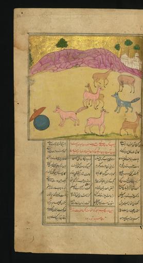 | Keywords: Jalal al-Din Rumi, Maulana - A Boastful Jackal - Walters W626110A - Full Page.jpg On this folio from Walters manuscript W 626 a jackal having colored his coat in a jar of paint boasts that he is more beautiful than peacocks islamic 1663 1073 ink and pigments on thin laid paper probably Kashmiri cm 26 5 15 accession number W 626 110A 83746 Ibrahim date and mode of acquisition unknown round seal impression Ibrahim on front flyleaf iia Henry Walters Baltimore date and mode of acquisition unknown Walters Art Museum Henry Walters Acquired by Henry Walters place of origin Bharat Walters Art Museum license 2D Manuscript by Rumi Walters MS 626 Media contributed by the Walters Art Museum needs category review |