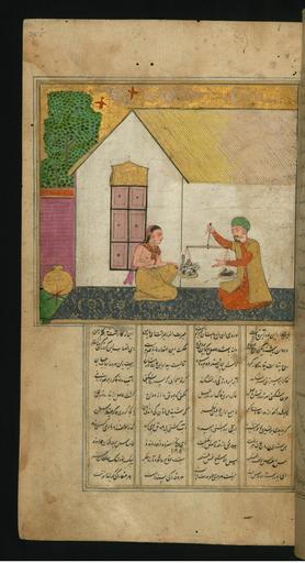 | Keywords: Jalal al-Din Rumi, Maulana - The Husband of a Greedy Woman - Walters W626255A - Full Page.jpg On this folio from Walters manuscript W 626 the husband of a greedy woman weighs the cat that supposedly ate all the meat that he bought for his guests islamic 1663 1073 ink and pigments on thin laid paper probably Kashmiri cm 26 5 15 accession number W 626 255A 83773 Ibrahim date and mode of acquisition unknown round seal impression Ibrahim on front flyleaf iia Henry Walters Baltimore date and mode of acquisition unknown Walters Art Museum Henry Walters Acquired by Henry Walters place of origin Bharat Walters Art Museum license 2D Manuscript by Rumi Walters MS 626 Media contributed by the Walters Art Museum needs category review |