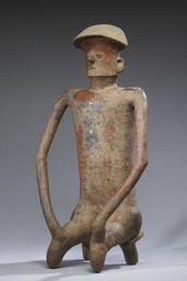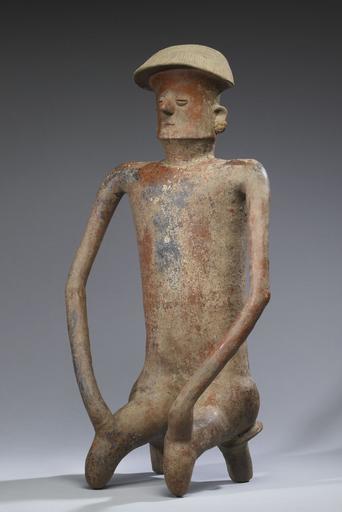 | Keywords: Jalisco - Seated Man - Walters 20092032 - Three Quarter Left.jpg This exceptional exploration of the human form has a number of characteristics that underscore the fact that ancient artistic styles throughout West Mexico do not conform to modern political boundaries despite our use of Mexican states to name the region's ancient cultures The facial features and figural abstraction attest to connections between the San Sebastián Red style of Jalisco and the Lagunillas pottery sculptures of adjacent Nayarit The male figure's serene countenance and seated position on a bench-throne suggest a person of high status his composed visage intimating that he is above the triviality of daily routine On the other hand his formal demeanor -arms held away from the body and hands resting securely on the knees- evokes a ritual pose like those of shamanic practices The lack of any articulation of dress-other than the earrings composed of a cluster of rounded forms-and the figure's self-possessed expression point to the interpretation of the work as an idealized portrayal of a shaman in trance 300 BC-AD 200 earthenware slip cm 63 4 36 22 5 accession number 2009 20 32 80187 Stendahl Galleries Los Angeles date and mode of acquisition unknown John G Bourne 1970s by purchase Walters Art Museum Gift of John Bourne 2009 place of origin Jalisco Mexico Walters Art Museum license Pottery from ancient Jalisco in the Walters Art Museum Art of Mexico Media contributed by the Walters Art Museum needs category review |