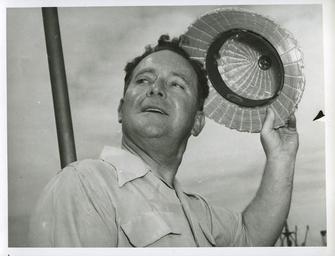 Keywords: photo border blackandwhite black and white Black and white photograph, landscape format, head and shoulder portrait of James Fitzpatrick. On the reverse of the print is the handwritten inscription: `James Fitzpatrick of "Travelogue fame" onboard RMS CARONIA Feb 1951.' James Fitzpatrick was an American documentary film maker who specialised in travel documentaries. He visited Australian shores in early 1951. During the three days RMS CARONIA was in Sydney in February 1951 Fitzpatrick filmed the sites and attractions of the city. The ANMM undertakes research and accepts public comments that enhance the information we hold about images in our collection. Photographer: Henry Gawthorpe Object no. 000018048 ANMM Collection Gift from Henry Gawthorpe Black and white photograph, landscape format, head and shoulder portrait of James Fitzpatrick. On the reverse of the print is the handwritten inscription: `James Fitzpatrick of "Travelogue fame" onboard RMS CARONIA Feb 1951.' James Fitzpatrick was an American documentary film maker who specialised in travel documentaries. He visited Australian shores in early 1951. During the three days RMS CARONIA was in Sydney in February 1951 Fitzpatrick filmed the sites and attractions of the city. The ANMM undertakes research and accepts public comments that enhance the information we hold about images in our collection. Photographer: Henry Gawthorpe Object no. 000018048 ANMM Collection Gift from Henry Gawthorpe