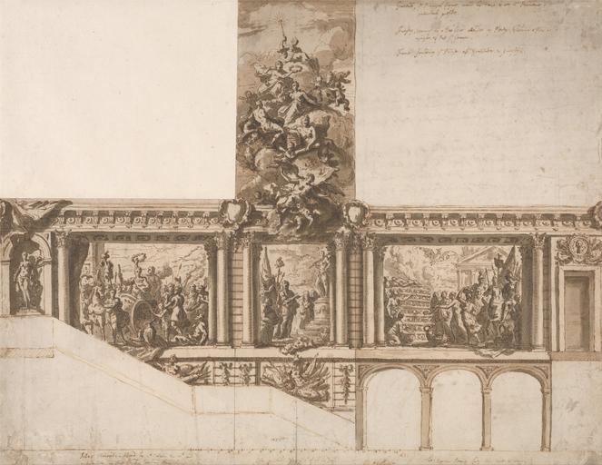 | Keywords: James Thornhill - Design for Ceiling Walls and Staircase - Google Art Project.jpg Inscribed in pen and brown ink upper right Gratitude ye Principal figure crownd by Peace over wch Providence particularly presides Industry leaning on a Bee hive attended by Plenty holding a plan or upright For St George Fame soudning ye praise of Gratitude Industry ; in graphite upper center 19 - 4 ; in pen and brown ink lower center 127 sequential numbers from 1 to 20 ; in pen and brown ink lower left Syllas Triumph is followd by ye Citizens c wth loud acclamation in that he has redeemd them from Slavery ; in pen and ink lower center Sylla gratefully offers ye 10th of all his Spoyls to Hercules ; in pen and brown ink lower right The Roman People Ladys c strive to adorn ye of Sylla ; in pen and brown ink lower center Thos Pitt ; inscribed on back extensive notes in pen and brown ink and in graphite Inscription _Signed_and_Dated Signed in graphite lower right Sir Jas Thornhill Not on View Pen and brown ink gray wash brown wash and graphite on medium slightly textured cream laid paper architectural subject horse animal children men women staircase chariot nude historical subject special url_id aAGuE5_T1rzRnA PD-old-100-1923 1734 James Thornhill Google Art Project works by James Thornhill |