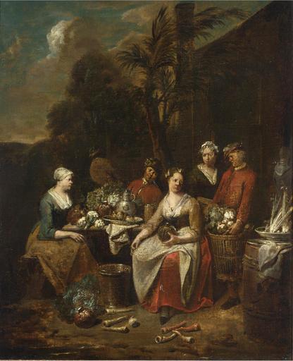 | Keywords: Jan Baptist Lambrechts - An elegant company conversing and playing tric-trac in a garden setting.jpg Artwork Creator Jan Baptist Lambrechts 1700-1731 Oil on canvas cm 57 47 5 At Sotheby's 15 November 2015 Amsterdam lot 119<br>A pair with Servants around a table with vegetables in a garden setting accession number place of creation http //www sothebys com/en/auctions/ecatalogue/2005/old-master-paintings-am0973/lot 119 html PD-old-100 other versions PD-old-100 Jan Baptist Lambrechts Games in Flemish genre paintings Merry companies in Flemish genre paintings |