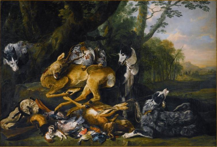 Keywords: Jan Fyt - The spoils of the chase being guarded by a dog, a landscape beyond.jpg Artwork Creator Jan Fyt 1649 Oil on canvas size cm 137 201 object history credit line signed and dated lower left Ioanes FyT /1649 formerly part of the Thyssen-Bornemisza collection sold at Sotheby's on 9 July 2014 accession number http //www sothebys com/en/auctions/ecatalogue/2014/old-master-british-paintings-evening-l14033/lot 58 html PD-old-100 PD-old-100 Hunting pieces by Joannes Fijt Baroque paintings of animals Hunting trophies in art 1649 paintings 17th-century still life paintings of dead game by Jan Fyt 17th-century greyhounds in art Hunting with greyhounds in art |