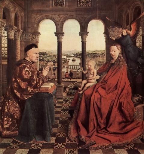 | Keywords: Jan van Eyck 070.jpg Artwork Q1516449 LangSwitch Madonna des Kanzlers Rolin The Virgin of chancellor Rolin La Vierge du chancelier Rolin De Maagd van kanselier Rolin Alternate titles LangSwitch Madonna des Kanzlers Nicholas Rolin Chancellor Rolin praying before the Virgin known as The Virgin of chancellor Rolin <ref>http //cartelfr louvre fr/cartelfr/visite srv car_not_frame idNotice 23981 Site officiel du musée du Louvre title translated by Wikimedia Commons </ref> Le Chancelier Rolin en prière devant la Vierge dit La Vierge du chancelier Rolin <ref>http //cartelfr louvre fr/cartelfr/visite srv car_not_frame idNotice 23981 Site officiel du musée du Louvre </ref> <br />La Vierge du chancelier Rolin ; dit aussi la Vierge d ™Autun <ref>http //www culture gouv fr/public/mistral/joconde_fr ACTION RETROUVER FIELD_1 DOMN VALUE_1 FIELD_2 Ctyob VALUE_2 FIELD_3 AUTR VALUE_3 27EYCK 20JAN 20VAN 27 FIELD_4 Clieu VALUE_4 FIELD_5 REPR VALUE_5 FIELD_6 Cdate VALUE_6 FIELD_7 Cdecv VALUE_7 FIELD_8 LOCA VALUE_8 FIELD_9 Mat e9riaux 20 2f 20Techniques VALUE_9 FIELD_10 Titre VALUE_10 NUMBER 6 GRP 0 REQ 28 28 27EYCK 20JAN 20VAN 27 29 20 3aAUTR 20 29 USRNAME nobody USRPWD 4 24 2534P SPEC 9 SYN 1 IMLY MAX1 1 MAX2 1 MAX3 100 DOM All Ministère de la culture - base Joconde </ref> <br />La Vierge au chancelier Nicolas Rolin Maria met kind met kanselier Nicolas Rolin 1376-1462 <ref>http //www rkd nl/rkddb/dispatcher aspx action search database ChoiceImages search priref 2110 RKDimages Kunstwerknummer 2110 </ref> oil on panel cm 66 62 Institution Louvre LangSwitch Inscription on the list top Inscriptie op de lijst boven A ™C IXH XAN object history 1434/1435 commissioned by Nicolas Rolin 1462 for the Église Notre-Dame du Châtel d'Autun Autun by 1794 Église Collégiale d'Autun Autun 1794 transferred to the Notre Dame d'Autun Autun 1796 nationalized 1800 transferred to the Musée Napoléon now Louvre Paris The Yorck Project 10 000 Meisterwerke der Malerei DVD-ROM 2002 ISBN 3936122202 Distributed by DIRECTMEDIA Publishing GmbH INV 1271 ~ 1435 creator Jan van Eyck http //mail wikipedia org/pipermail/wikide-l/2005-April/012195 html Other versions <table style background-color EEEFFF > <tr> <td>120x120px</td> <td valign top > File Eyck madonna rolin jpg<br />Version from cgfa sunsite dk</td> </tr> </table> 00000081347 PD-old-100 PD-Art-YorckProject LangSwitch Hinweis References Noten <references /> ImageNote 1 25 535 683 1460 2024 2165 2 220px<br /> File Chancellor rolllin detail jpg<br />Detail ImageNoteEnd 1 ImageNote 2 271 564 1522 867 2024 2165 2 299px<br /> File Jan van Eyck 071 jpg<br />Detail ImageNoteEnd 2 ImageNote 3 1485 177 340 416 2024 2165 2 299px<br /> File Jan van Eyck 072 jpg<br />Detail ImageNoteEnd 3 ImageNote 4 922 1688 376 434 2024 2165 2 299px<br /> File Jan van Eyck 073 jpg<br />Detail ImageNoteEnd 4 ImageNote 5 4 192 708 423 2024 2165 2 299px<br /> File Jan van Eyck 074 jpg<br />Detail ImageNoteEnd 5 ImageNote 6 860 1171 69 87 2024 2165 2 220px<br /> File Rolin-Madonna - Begrabene Hasen jpg<br />Hasen unter einer Säule ImageNoteEnd 6 The Virgin with Chancellor Rolin 01 Virgin Mary crowned by angels |