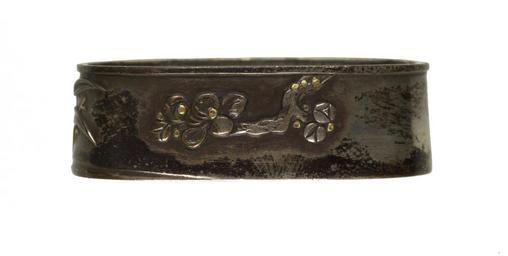 Keywords: Japanese - Fuchi with Bamboo and Plums - Walters 5112433A - Back.jpg The fuchi is decorated with bamboo on the front and plum blossoms on the reverse It may have originally been paired with a kashira depicting pine trees because those three plants are known as the three friends of winter This is part of a mounted set early-mid 19th century Edo shibuichi gold cm 3 9 2 1 1 2 accession number 51 1243 3A 79624 Henry Walters Baltimore date and mode of acquistion unknown Walters Art Museum Henry Walters Acquired by Henry Walters Mark Assembly mark in ink inside fuchi i jyô tsu ki place of origin Japan Walters Art Museum license Fuchi in the Walters Art Museum White background Media contributed by the Walters Art Museum needs category review |