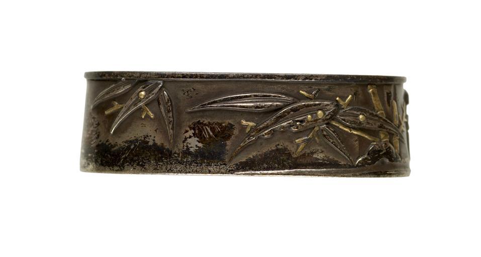 Keywords: Japanese - Fuchi with Bamboo and Plums - Walters 5112433A.jpg The fuchi is decorated with bamboo on the front and plum blossoms on the reverse It may have originally been paired with a kashira depicting pine trees because those three plants are known as the three friends of winter This is part of a mounted set early-mid 19th century Edo shibuichi gold cm 3 9 2 1 1 2 accession number 51 1243 3A 79624 Henry Walters Baltimore date and mode of acquistion unknown Walters Art Museum Henry Walters Acquired by Henry Walters Mark Assembly mark in ink inside fuchi i jyô tsu ki place of origin Japan Walters Art Museum license Fuchi in the Walters Art Museum White background Media contributed by the Walters Art Museum needs category review |