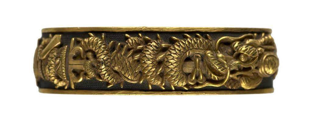 | Keywords: Japanese - Fuchi with Sword and Dragon - Walters 5112683A.jpg This iconography of a dragon wrapped around a sword represents Kôbô Daishi's sword Kôbô Daishi also known as Kûkai; 774-834 was a Buddhist priest who studied in China and founded the Shingon sect of Buddhism in Japan It is said he used a sword that had a rain dragon wrapped around it to bring rain at the end of a drought This is part of a mounted set century 18 19 Edo shakudo gold cm 3 8 accession number 51 1268 3A 14064 William T / Henry Walters Collection Baltimore date and mode of acquisition unknown Walters Art Museum Henry Walters Acquired by William T or Henry Walters none place of origin Japan Walters Art Museum license Tosogu Japanese sword fittings in the Walters Art Museum Media contributed by the Walters Art Museum needs category review |