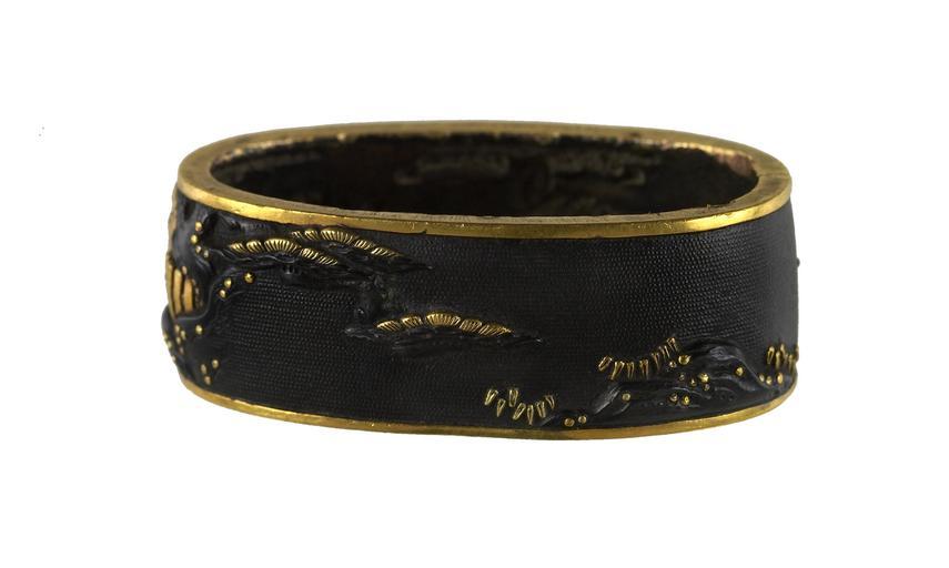| Keywords: Japanese - Fuchi with Two Samurai - Walters 5112543A - Back.jpg  Two samurai dressed in armor are depicted kneeling at the foot of a short set of stairs They may be kneeling before their lord who is depicted on the matching kashira This is part of a mounted set century 18 19 Edo shakudo gold sentoku silver cm 3 8 accession number 51 1254 3A 10190 Henry Walters Baltimore date and mode of acquisition unknown Walters Art Museum Henry Walters Acquired by Henry Walters none place of origin Japan Walters Art Museum license Tosogu Japanese sword fittings in the Walters Art Museum Media contributed by the Walters Art Museum needs category review |