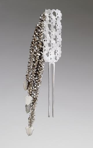 Keywords: Japanese - Hair Ornament - Walters 571341 - View C.jpg Perhaps designed to decorate the complex hairstyle of a geisha this dangling piece would lend a sparkling bit of movement to the rigid hairstyle of a young woman as she danced or sang traditional folksongs Geisha and their younger apprentices maiko continue to dress each evening in elaborate silk kimono stark white face paint and grandly jeweled hairdos or wigs in order to entertain high-paying restaurant customers in Kyoto and other metropolitan Japanese cities century 19 silver gold cm 20 8 accession number 57 1341 35517 Henry Walters Baltimore date and mode of acquisition unknown Walters Art Museum Henry Walters Acquired by Henry Walters none Bedazzled 5 000 Years of Jewelry from the Walters Art Museum Frist Center for the Visual Arts Nashville; The John and Mable Ringling Museum of Art Sarasota; The Walters Art Museum Baltimore 2006-2009 place of origin Japan Walters Art Museum license Art of Japan in the Walters Art Museum Jewellery in the Walters Art Museum Media contributed by the Walters Art Museum needs category review Kanzashi |