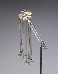 Keywords: Japanese - Hair Ornament - Walters 571342.jpg Perhaps designed to decorate the complex hairstyle of a geisha this dangling piece would lend a sparkling bit of movement to the rigid hairstyle of a young woman as she danced or sang traditional folksongs Geisha and their younger apprentices maiko continue to dress each evening in elaborate silk kimono stark white face paint and grandly jeweled hairdos or wigs in order to entertain high-paying restaurant customers in Kyoto and other metropolitan Japanese cities century 19 silver gold cm 17 6 accession number 57 1342 10263 Henry Walters Baltimore date and mode of acquisition unknown Walters Art Museum Henry Walters Acquired by Henry Walters none Bedazzled 5 000 Years of Jewelry from the Walters Art Museum Frist Center for the Visual Arts Nashville; The John and Mable Ringling Museum of Art Sarasota; The Walters Art Museum Baltimore 2006-2009 place of origin Japan Walters Art Museum license Art of Japan in the Walters Art Museum Jewellery in the Walters Art Museum Media contributed by the Walters Art Museum needs category review Kanzashi |