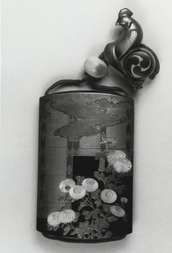 | Keywords: Japanese - Inro with Crysanthemums Outside Veranda Screens, with Netsuke - Walters 67517.jpg Walters Art Museum artwork Anonymous Japanese <br/> A standard oblong black and gold lacquer four compartment inro A design around the inro of partially raised bamboo blinds with clouds and three different types of chrysanthemums outside and in front of the blinds in hiramakie in gold and silver lacquer with okibirame chrysanthemums in bold design of inlaid raden red and gold lacquer The red lacquer on on one side and the inlaid raden on the other All on a ground roiro and jimaki The interior of nashiji and fundame Inscribed on the bottom of the lower compartment The cord channels are external Together with a carved lacquered wood netsuke of a cock perched on a drum early Other date century 19 Edo lacquer raden coral wood inro cm 8 9 5 7 1 9 accession number 67 517 2485 William T / Henry Walters Collection Baltimore date and mode of acquisition unknown Walters Art Museum Henry Walters Acquired by William T or Henry Walters Signature Kyukoku Netsuke Miniature Sculpture of Japan Japanese Lacquers The Walters Art Gallery Baltimore 1984 place of origin Japan Walters Art Museum license Netsuke Miniature Sculpture of Japan Inro in the Walters Art Museum Chrysanthemums in art Kyukoku |