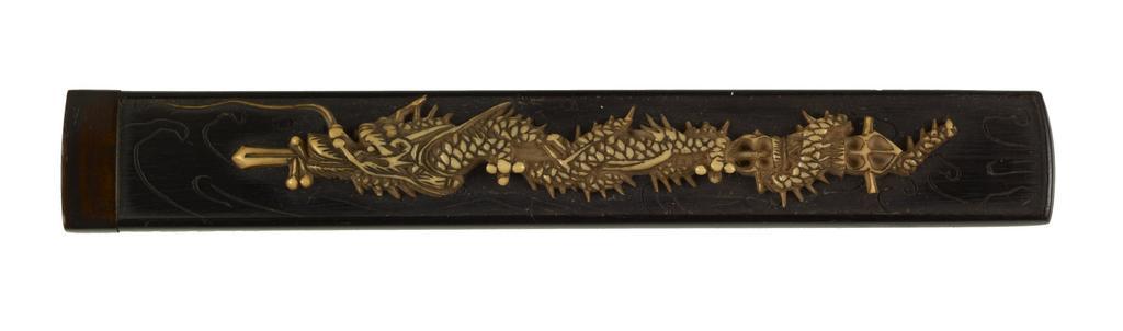 | Keywords: Japanese - Kozuka with a Dragon Coiled around a Sword - Walters 51645.jpg This is the rain dragon coiled around Kôbô Daishi's sword Kôbô Daishi also known as Kûkai; 774-834 was a Buddhist priest who studied in China and founded the Shingon sect of Buddhism in Japan It is said he used a sword that had a dragon wrapped around it to bring rain at the end of a drought This kozuka is unusual because it is made of wood and ivory with a tortoise shell cap date wood ivory cm 9 9 accession number 51 645 15427 Henry Walters Baltimore date and mode of acquisition unknown Walters Art Museum Henry Walters Acquired by Henry Walters Unsigned place of origin Japan Walters Art Museum license Kozuka in the Walters Art Museum Media contributed by the Walters Art Museum needs category review |