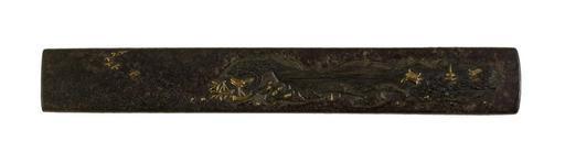 Keywords: Japanese - Kozuka with a Mountain Landscape - Walters 51654.jpg This kozuka depicts a landscape near water Two bodies of land on in the middle and one on the right are connected by a bridge At the right the top of a pagoda and other temple buildings can be seen above the tree tops On the left side of the bridge are huts There are boats in the water to the left of the huts In the background mists shroud distant mountains At the left of the kozuka six geese are depicted in flight date iron gold cm 9 9 accession number 51 654 6415 Henry Walters Baltimore date and mode of acquisition unknown Walters Art Museum Henry Walters Acquired by Henry Walters none place of origin Japan Walters Art Museum license Tosogu Japanese sword fittings in the Walters Art Museum Media contributed by the Walters Art Museum needs category review |