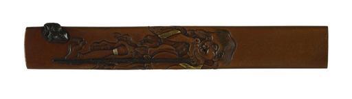 Keywords: Japanese - Kozuka with the Taoist Immortal Gama and His Toad - Walters 51690.jpg The man shown resting on his walking stick is the Taoist immortal Gama At the bottom is a three-legged frog Gama's spirit was able to leave his body to wander and once returned to find the body unfit to reinhabit He put his spirit into the nearest creature which was a frog century 19 Edo-Meiji copper shibuichi and gold cm 9 8 accession number 51 690 14600 Henry Walters Baltimore date and mode of acquisition unknown Walters Art Museum Henry Walters Acquired by Henry Walters none place of origin Japan Walters Art Museum license Kozuka in the Walters Art Museum Media contributed by the Walters Art Museum needs category review |