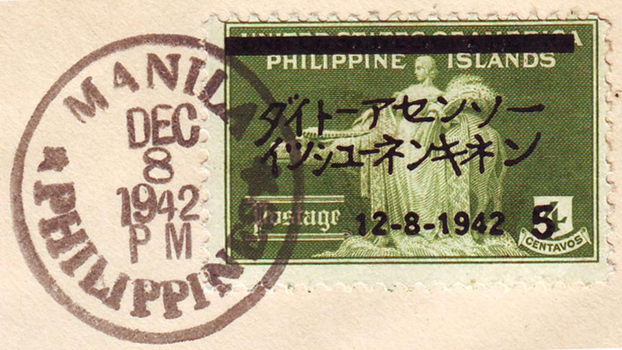 Keywords: Japanese Overprint of US Phillipine Islands Stamp 1942.jpg 5 Centavo overprint on 4 Centavo United States of America Philippine Islands 1935 Agriculture issue Woman and Carabao statue postage stamp overprinted under Japanese occupation commemorating the First Anniversary of the Great East Asia War Postmark MANILA PHILIPPINES DEC 8 1942 PM <small> CDS </small> Base stamp 4c Agriculture issue of 1935 <small> yellow green </small> Overprint in black First Anniversary Greater East Asia War <small> in Japanese </small> with date 12-8-1942 and value 5 <small> over 4 Centavos </small>; Deleting bar at top to obliterate United States of America <small>NOTE Although the Japanese attack on Pearl Harbor took place on the morning of Sunday December 7 1941 Hawaiian time as Japan is West of the International Date Line it was Monday there thus making December 8 1942 the correct date in Asia to observe the first anniversary of the start of the War </small> The Cooper Collection of Postal History <small> Private collection </small> 1935 <small> Original issue </small>; December 8 1942 <small> overprint </small> Bureau of Engraving and Printing Washington DC <small> Base stamp </small>; Bureau of Printing Manila <small> overprint </small> PD-USGov Original upload log en wikipedia Japanese+Overprint+of+US+Phillipine+Islands+Stamp+1942 jpg wikitable - 2009-06-12 11 26 901×508× 506952 bytes Centpacrr stamp Uncategorized 2016 June 25 |