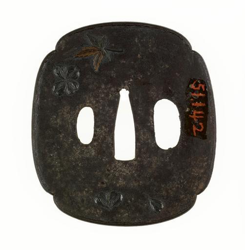 Keywords: Japanese (signature illegible) - Tsuba with Maple Leaves and Cherry Blossoms - Walters 51142 - Back.jpg This tsuba is decorated with the most popular motifs for spring and autumn Cherry blossoms at the upper right are a sign of spring The flowers are made of silver Maple leaves which are associated with autumn are in the lower left One leaf is made of gold The other is decorated with copper and a copper alloy with gold Both cherry blossoms and maple leaves inspire picnics and other activities center on enjoying their beauty century 19 Edo-Meiji iron copper silver cm 7 3 6 6 0 44 accession number 51 142 4397 Henry Walters Baltimore date and mode of acquisition unknown Walters Art Museum Henry Walters Acquired by Henry Walters Signature illegible place of origin Japan Walters Art Museum license Tsuba in the Walters Art Museum White background Media contributed by the Walters Art Museum needs category review