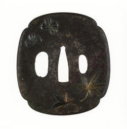 Keywords: Japanese (signature illegible) - Tsuba with Maple Leaves and Cherry Blossoms - Walters 51142.jpg This tsuba is decorated with the most popular motifs for spring and autumn Cherry blossoms at the upper right are a sign of spring The flowers are made of silver Maple leaves which are associated with autumn are in the lower left One leaf is made of gold The other is decorated with copper and a copper alloy with gold Both cherry blossoms and maple leaves inspire picnics and other activities center on enjoying their beauty century 19 Edo-Meiji iron copper silver cm 7 3 6 6 0 44 accession number 51 142 4397 Henry Walters Baltimore date and mode of acquisition unknown Walters Art Museum Henry Walters Acquired by Henry Walters Signature illegible place of origin Japan Walters Art Museum license Tsuba in the Walters Art Museum White background Media contributed by the Walters Art Museum needs category review