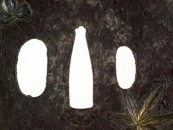 Keywords: Japanese (signature illegible) - Tsuba with Maple Leaves and Cherry Blossoms - Walters 51142 - Mark.jpg This tsuba is decorated with the most popular motifs for spring and autumn Cherry blossoms at the upper right are a sign of spring The flowers are made of silver Maple leaves which are associated with autumn are in the lower left One leaf is made of gold The other is decorated with copper and a copper alloy with gold Both cherry blossoms and maple leaves inspire picnics and other activities center on enjoying their beauty century 19 Edo-Meiji iron copper silver cm 7 3 6 6 0 44 accession number 51 142 4397 Henry Walters Baltimore date and mode of acquisition unknown Walters Art Museum Henry Walters Acquired by Henry Walters Signature illegible place of origin Japan Walters Art Museum license Tsuba in the Walters Art Museum White background Media contributed by the Walters Art Museum needs category review