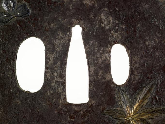 View Original:Japanese_(signature_illegible)_-_Tsuba_with_Maple_Leaves_and_Cherry_Blossoms_-_Walters_51142_-_Mark.jpg (1799x1350)